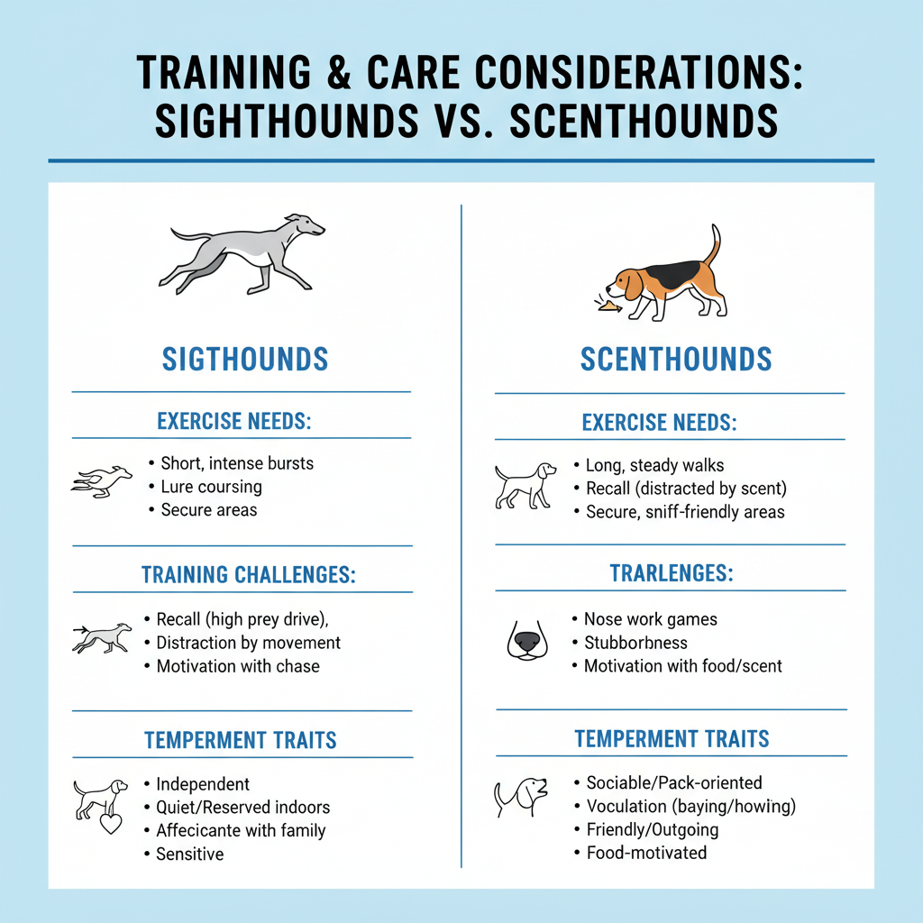 - Recall: Both types of hounds can be tricky to teach a reliable recall. Their instinct to chase (sighthounds) or follow a scent (scenthounds) often overrides their desire to listen. Start early with positive reinforcement, and keep up with consistent training. Leash training is also absolutely vital for these wanderers!