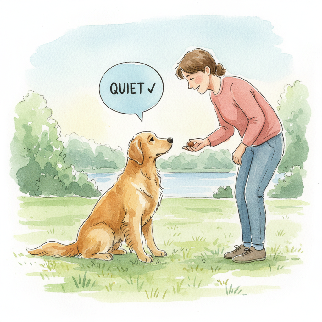 Start practicing in a peaceful spot, then slowly introduce more distractions. With consistent practice, your dog will learn to quiet down on command, no matter the situation.