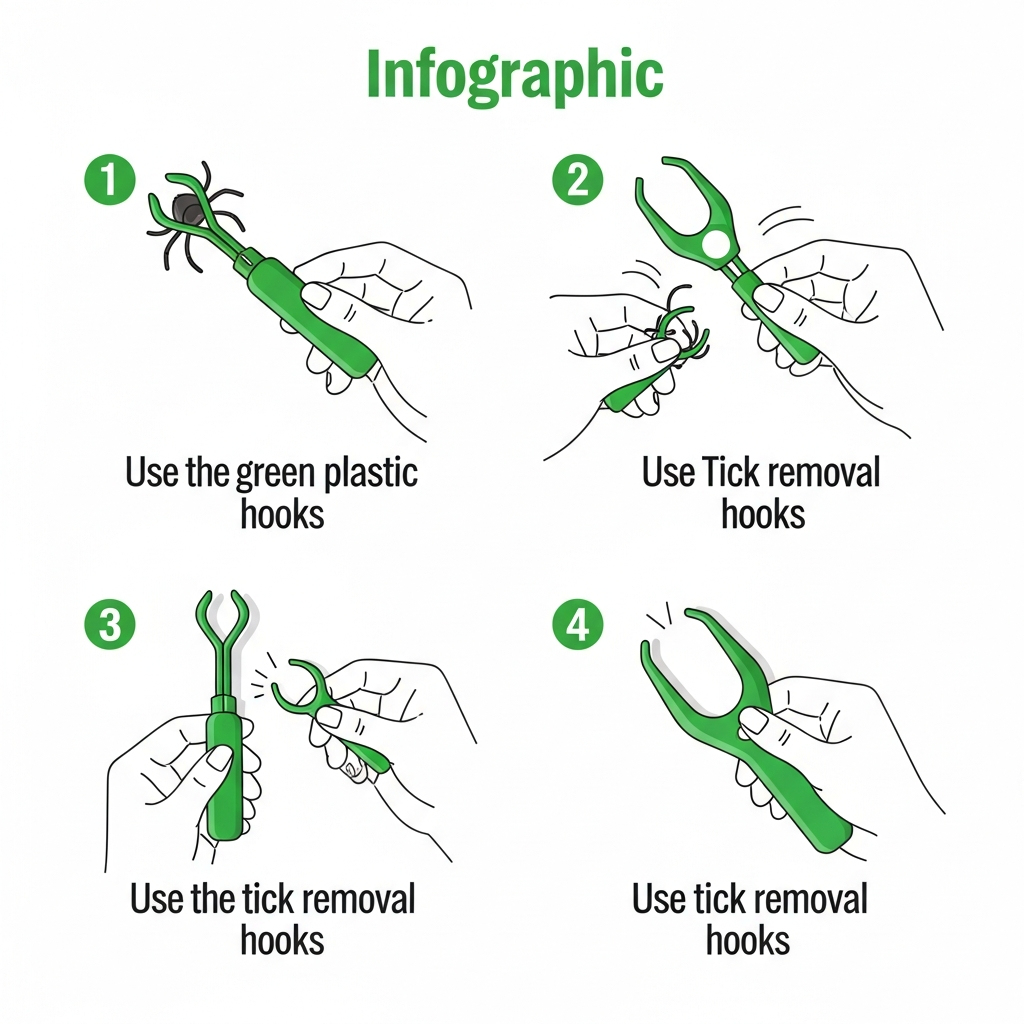 Grab the right tool for the job depending on the tick's size. For the popular green plastic hooks, just slide the hook along your dog's skin until it catches the tick in the crevice. Then, gently twist it 2 to 3 times and pull away. The blue spring tweezer grabs the tick automatically, so you don't have to squeeze tightly while pulling and risk crushing the bug.