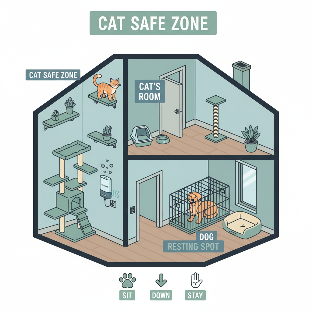- Create safe zones: Cats need high-up places where they can escape from the dog. Think cat trees, shelves, or rooms with baby gates that a cat can easily jump over but a dog can't.