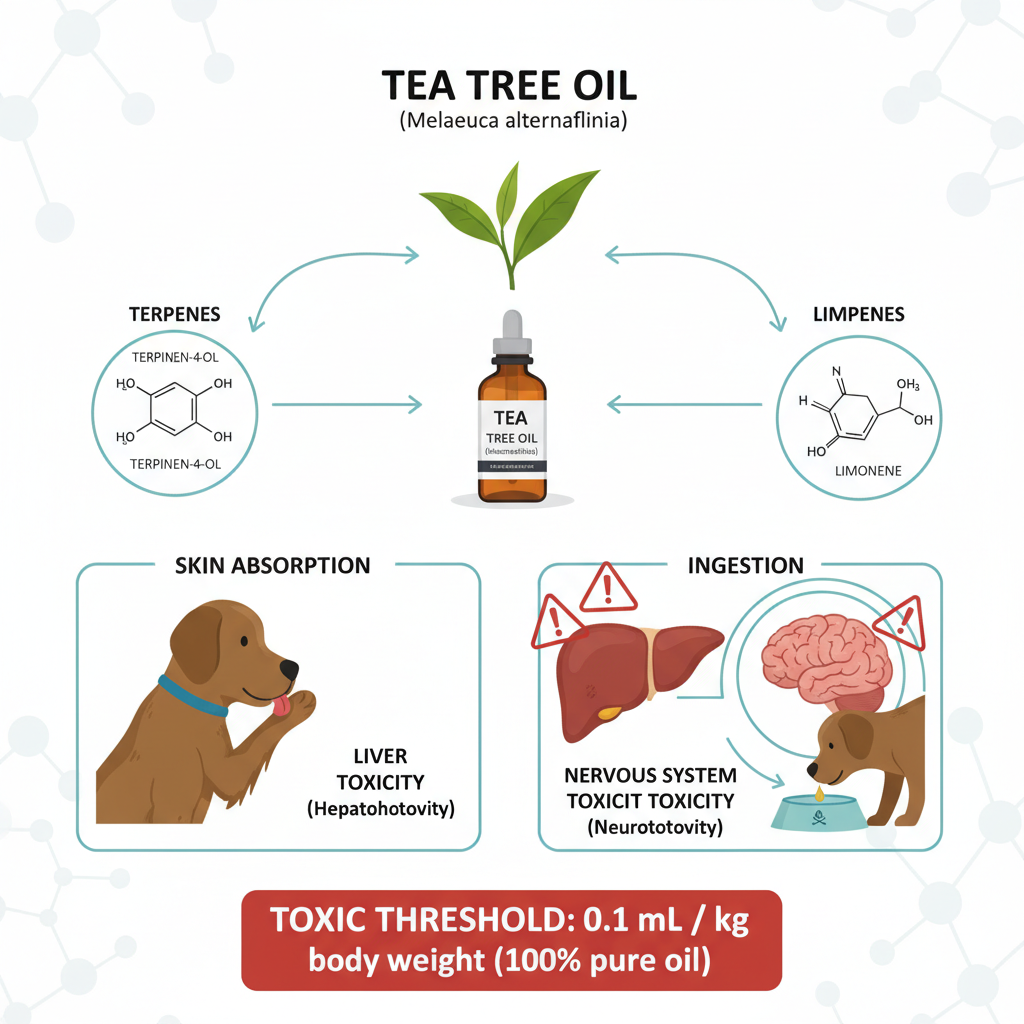 Tea tree oil is packed with compounds called terpenes. These are what give the oil its distinctive smell and some of its supposed health benefits for humans. However, for dogs, if they swallow or absorb too many of these terpenes, it can seriously harm their liver and nervous system.