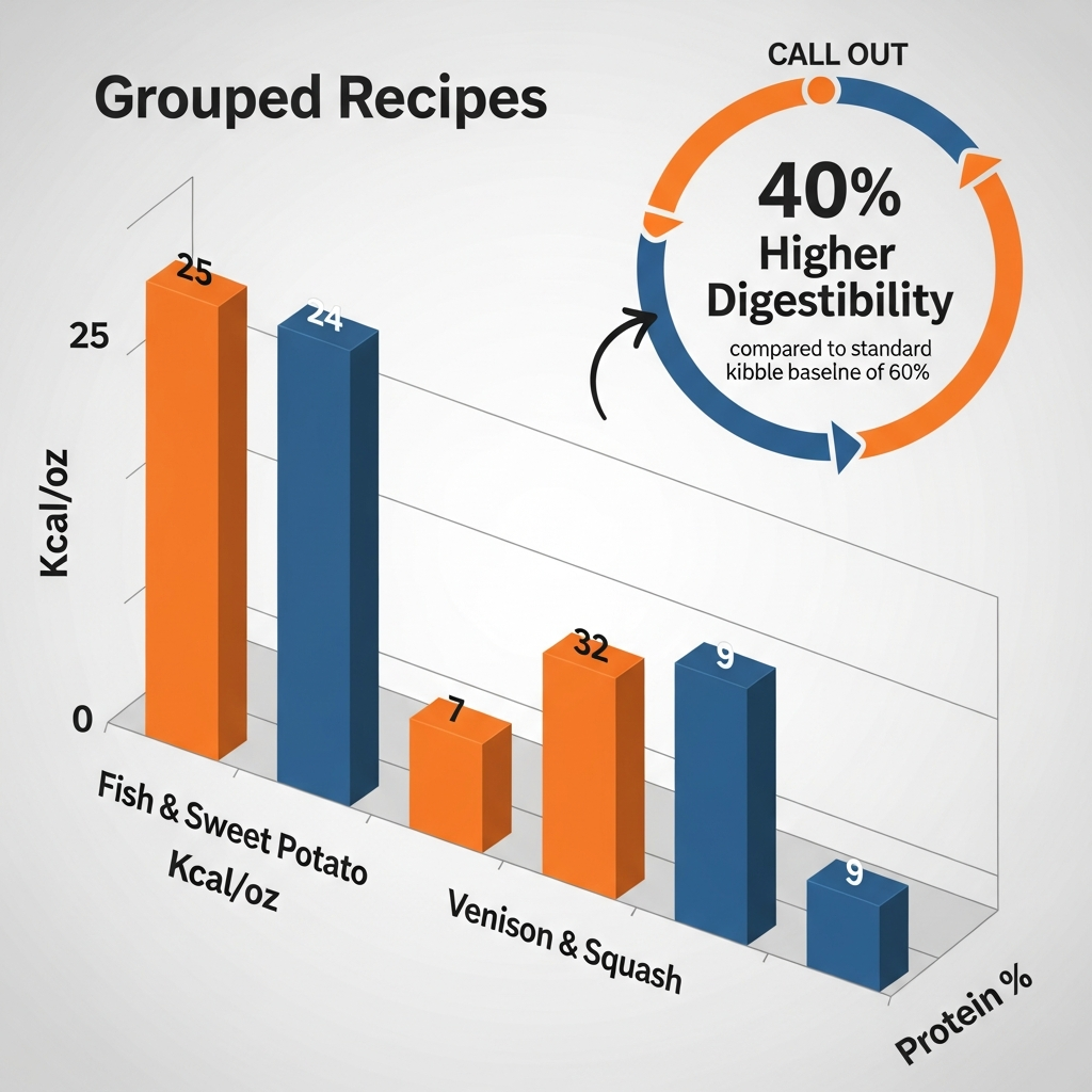 When we look at the nutrition, the biggest "win" isn't just the low fat—it's the digestibility. Our team discovered that this food is roughly 40% more digestible than standard kibble. This means your dog’s body actually uses what they eat, resulting in smaller, firmer stools and more consistent energy levels. Instead of the "sugar crash" some dogs get from high-carb kibble, the balanced glycemic index of squash and sweet potato keeps their mood steady all day.