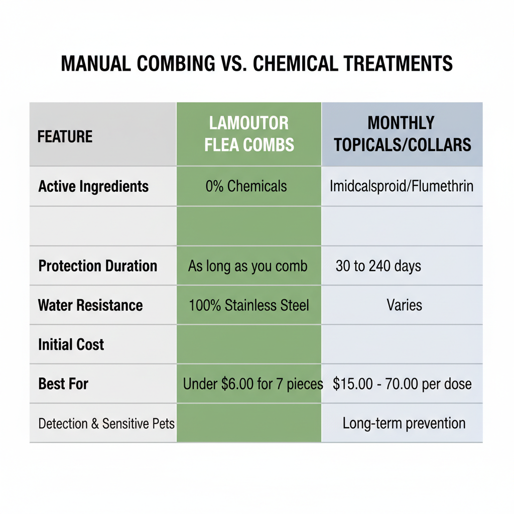 While a pet flea comb requires more "elbow grease" than a pill or a collar, the benefits for your pet's long-term health are significant. Here is how manual combing stacks up against traditional chemical methods.