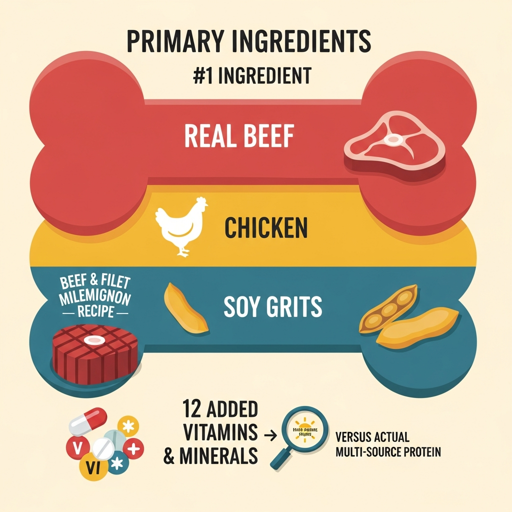 Our research into the ingredient list shows that while the label highlights a "Beef & Filet Mignon Recipe," these aren't a single-source protein treat. The recipe starts strong with real beef, followed by chicken and soy grits. This isn't a 100% single-source meat product, which is something to keep in mind if your dog has specific poultry allergies. The treats are baked, a process the manufacturer has used for over a century, which helps maintain a consistent texture and integrates the added 12 vitamins and minerals directly into the snack.