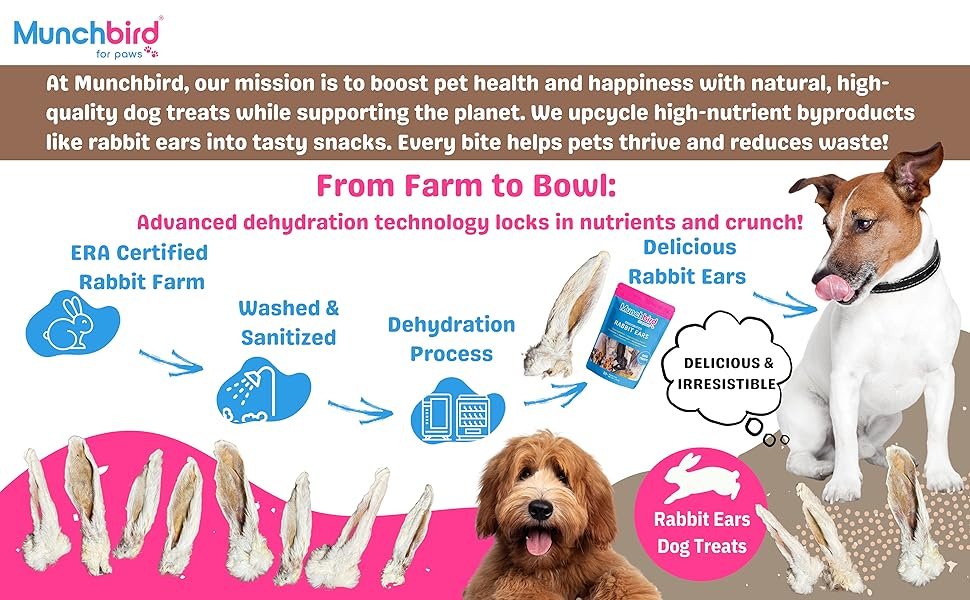 Munchbird Dehydrated Rabbit Ears are a premium, single-ingredient chew featuring natural fur to boost digestive health and scrub teeth clean, making them a fantastic hypoallergenic choice for dogs of all breeds and life stages, particularly those with sensitive bellies or joint concerns.
