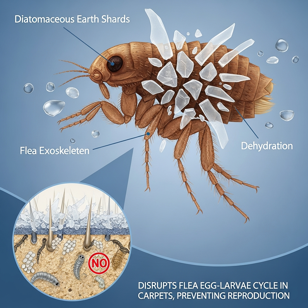 The real heavy lifter making up the bulk of the formula (91.5%) is a blend of inert ingredients starring Diatomaceous Earth. To a flea, diatomaceous earth acts like microscopic shards of glass. It mechanically scores their outer shell, dehydrating and destroying adult fleas while effectively breaking the egg-larvae cycle so they can't reproduce in your rugs.