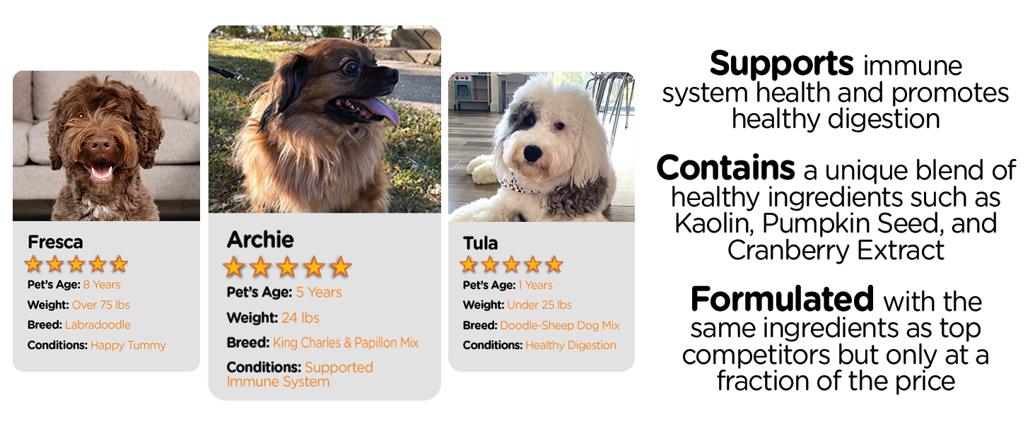 Pet Reaction: Most dogs tolerate these very well. However, because of the fiber and herbal content, a small percentage of owners reported some initial digestive upset or loose stools. It's always a good idea to start with a half-dose to let their stomach adjust.