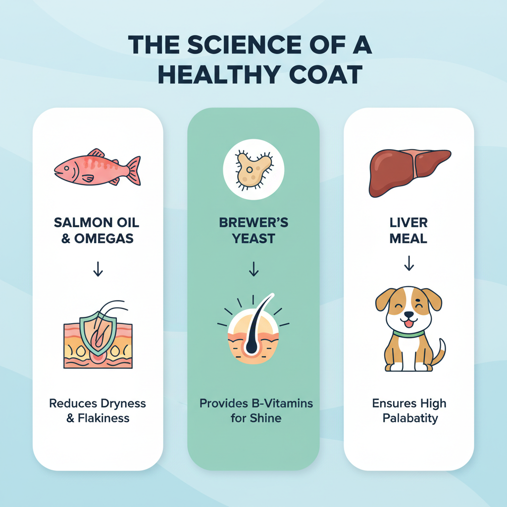 The heavy hitters here are Salmon Oil and Omega fatty acids. These aren't just for shine; they work to reinforce the skin's natural barrier. The addition of Brewer’s Dried Yeast provides essential B vitamins, while the liver meal and dried cheese act as the flavor magnets that get dogs excited.