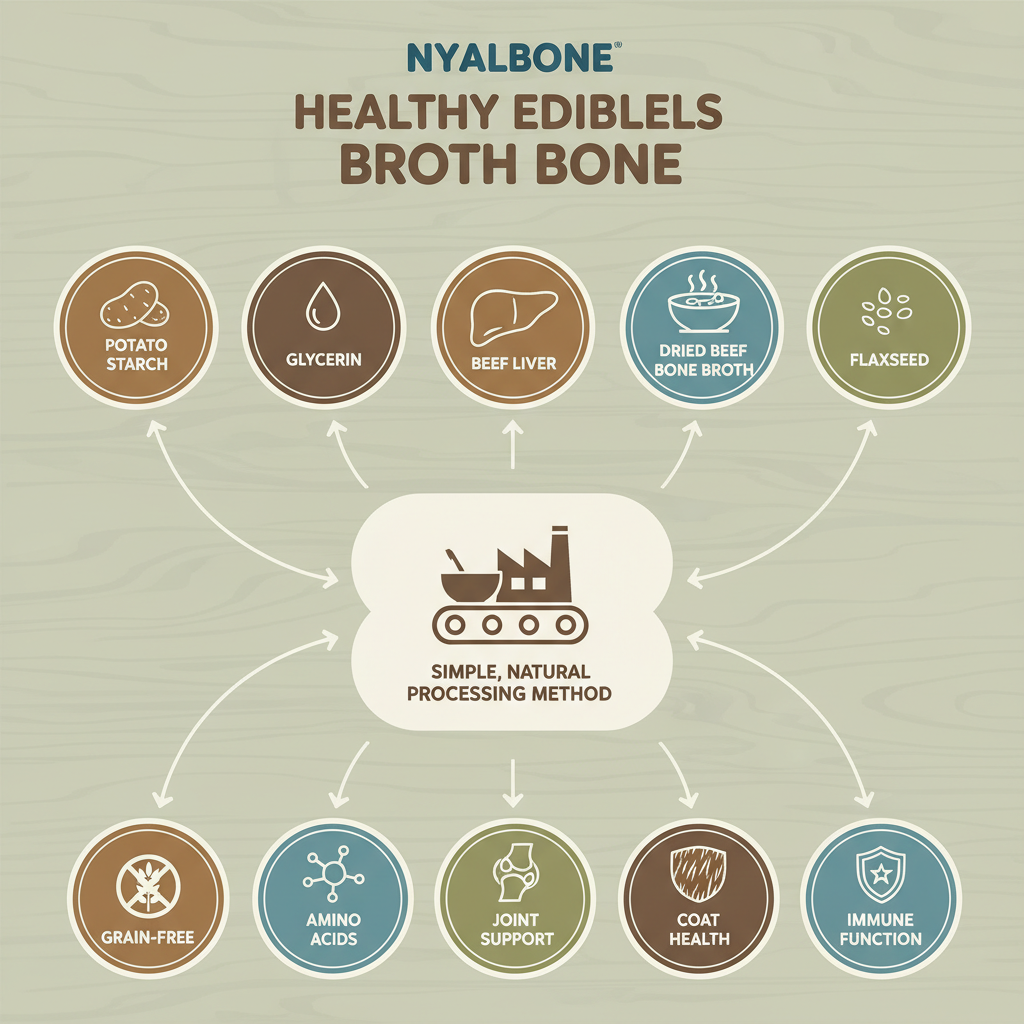 When we look at the ingredients of the Nylabone Healthy Edibles Broth Bone, the focus on simplicity is clear. The base is potato starch and glycerin, making this a grain-free option for sensitive pups.