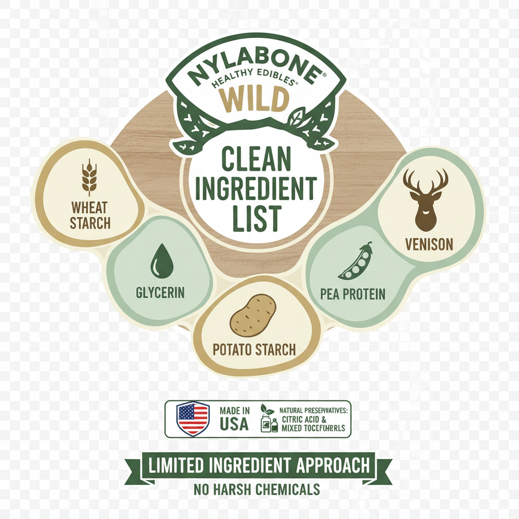 Our team at Petscarelab took a close look at the ingredient deck for Nylabone Healthy Edibles WILD venison treats. While these aren't a 100% single-source meat chunk—they are formulated edible chews—the recipe is impressively clean. The base consists of wheat starch, glycerin, and potato starch, with pea protein and real venison providing the nutritional "oomph." We appreciate the limited-ingredient approach, which cuts out the typical fillers found in cheaper supermarket bones. These treats are proudly made in the USA, and the processing stays away from harsh chemical treatments, relying on natural preservatives like citric acid and mixed tocopherols to keep things fresh.