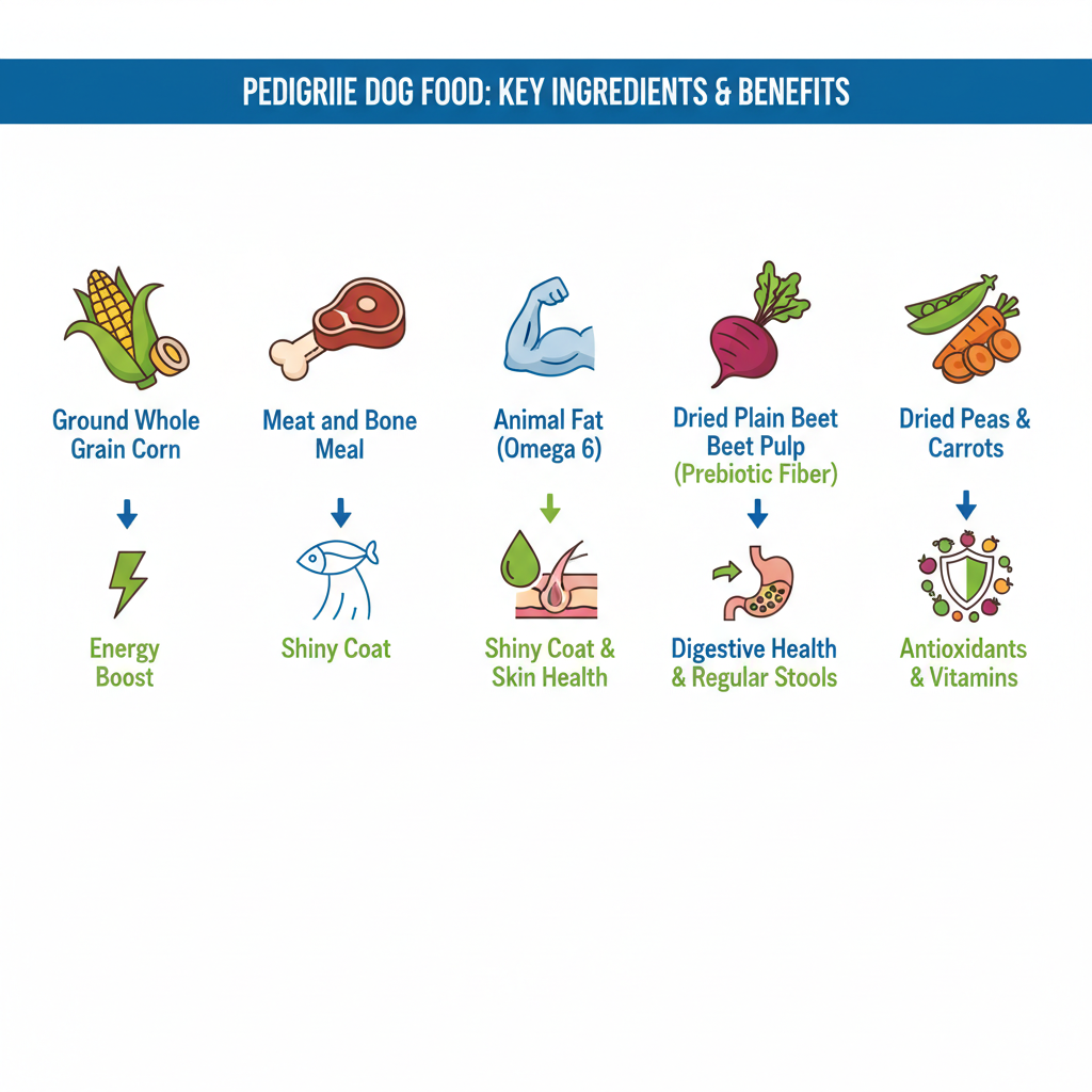 When you flip over a bag of Pedigree, you’re looking at a formula designed for high-volume energy and basic maintenance. The recipe leans heavily on grains for energy, which is common for "value" tier foods, but it doesn't skimp on the micronutrients your dog needs to stay spunky. It skips the high fructose corn syrup and added sugars, which we appreciate for keeping weight in check.