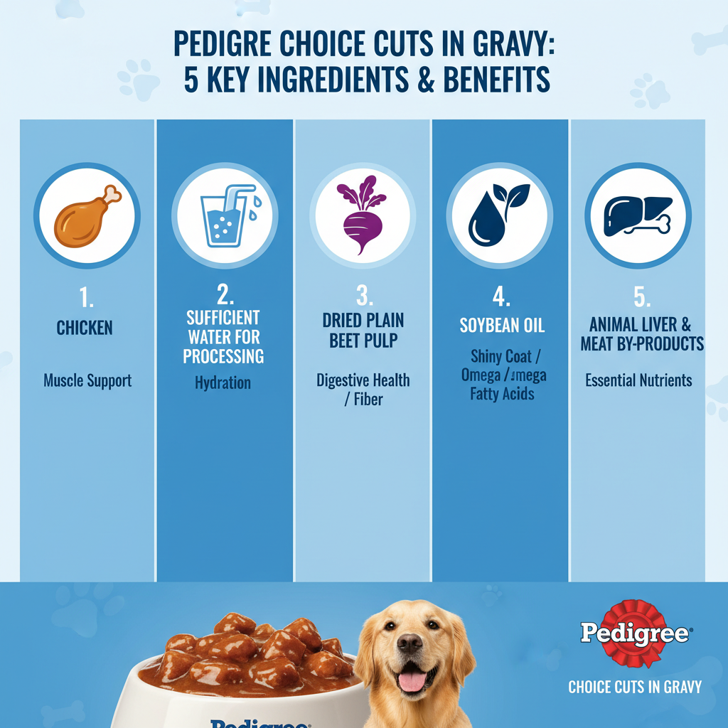 When you rip open a pouch of Pedigree Choice Cuts in Gravy Adult Wet Dog Food, the first thing you’ll notice is the aroma—it smells like a Sunday dinner, which is exactly why dogs go crazy for it. Our team at Petscarelab analyzed the label to see if the nutrition matches the "beg-worthy" scent. This recipe is formulated to meet AAFCO nutritional levels for adult maintenance, focusing on muscle support and skin health through a blend of 36 different vitamins, minerals, and amino acids.