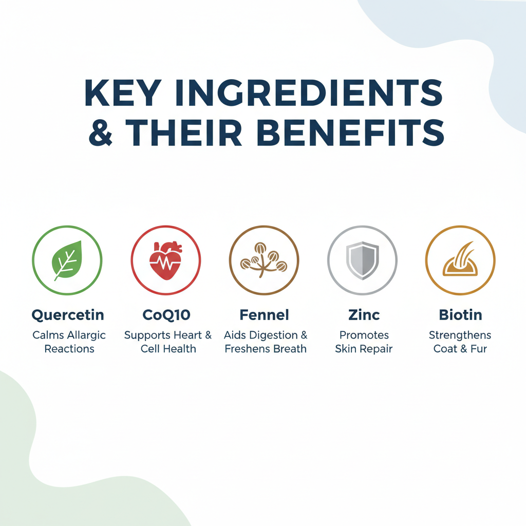 This supplement is a powerhouse of nutrients. It uses Quercetin, often called "nature’s Benadryl," to help calm down allergic reactions and skin inflammation. CoQ10 supports cell growth and heart health, while Fennel is the secret weapon for digestion and gas—an unusual but welcome addition to a coat supplement.