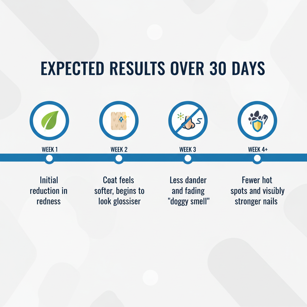 - This is where the magic happens. The Lysine and B12 start to kick in, making the coat feel softer and look significantly glossier. Owners of "stinky" dogs noticed the "doggy smell" (often caused by yeast on the skin) began to fade as the skin barrier got stronger.