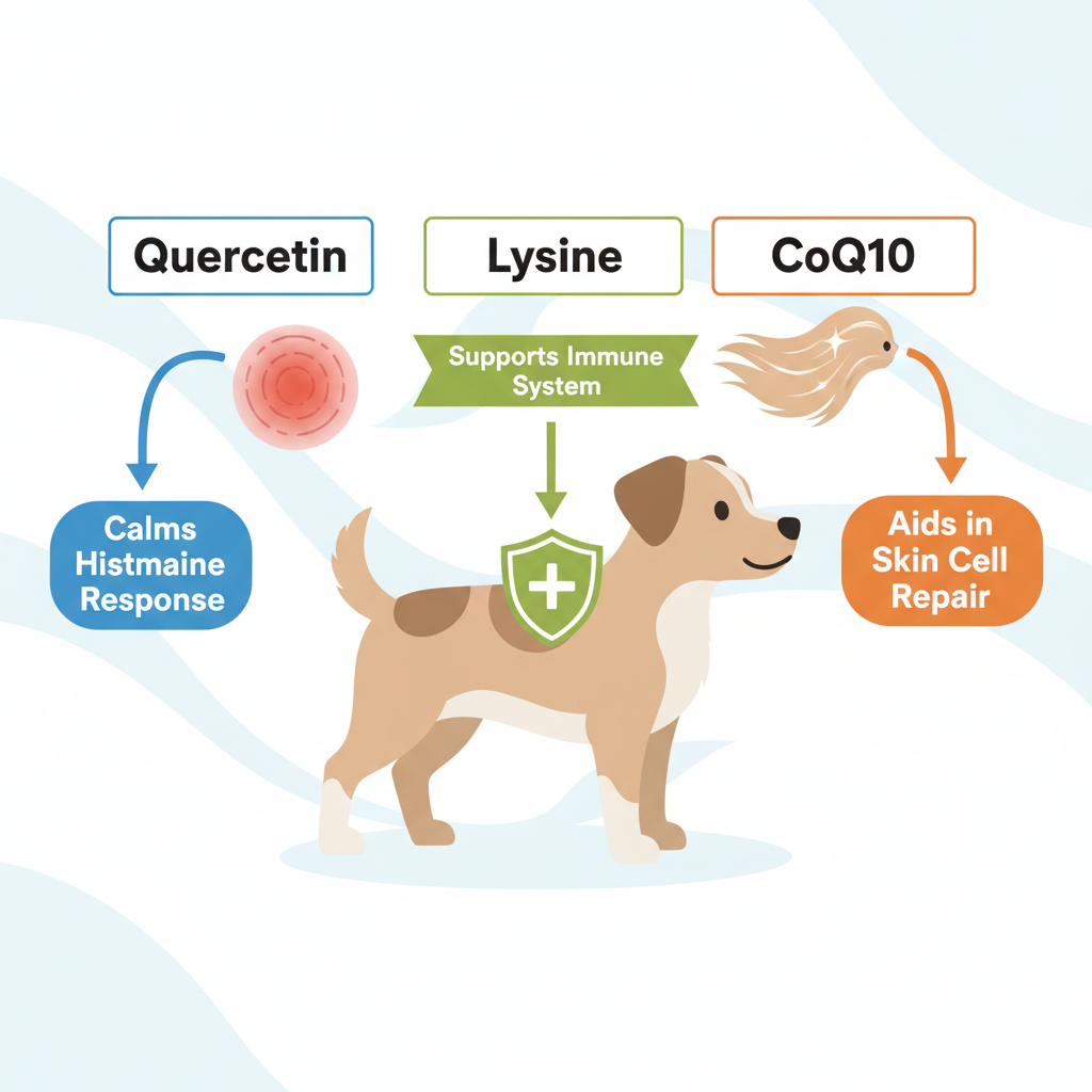 - This formula leans heavily on Quercetin, often called "nature's Benadryl" because of its ability to calm down histamine responses. They've also included Lysine, an essential amino acid that supports the immune system, and CoQ10 for cellular repair.