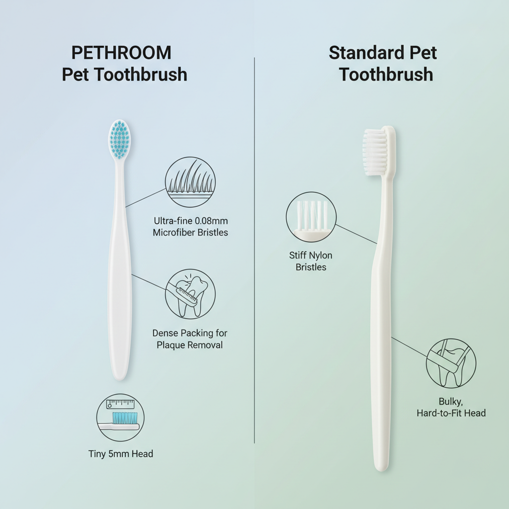 The "magic" here is in the bristles. PETHROOM uses microfiber PBT material. These bristles are five times softer than what you'll find on a cheap grocery store pet brush. They are packed densely to sweep away plaque rather than just scratching the surface.