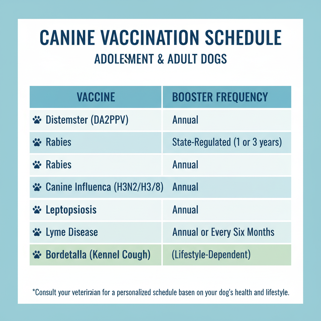 Annual boosters typically cover influenza, leptospirosis, and Lyme disease, while Bordetella (kennel cough) vaccines are often given every six months to maintain protection. Always check with your veterinarian to keep your dog’s immunizations up to date and tailored to their lifestyle.