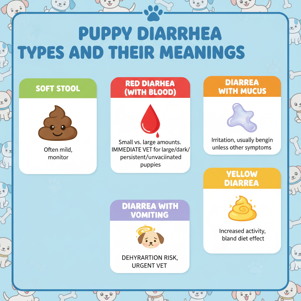 Diarrhea in puppies can present in different forms—from mild softness to severe, watery discharge, and even color changes. Here’s a rundown of common diarrhea types and what they might indicate: