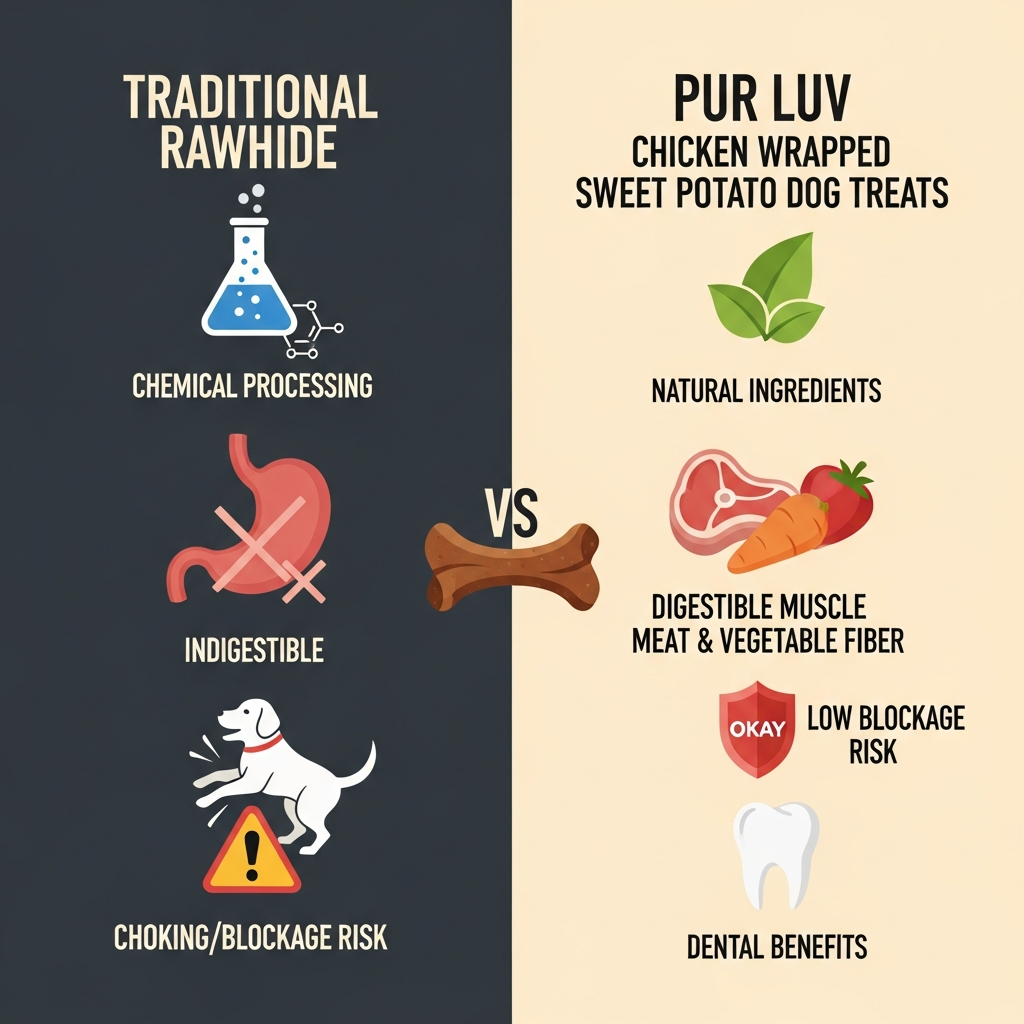 The biggest win for these treats is that they are 100% rawhide-free. Traditional rawhide is notorious for being chemically bleached and potentially causing internal blockages because it doesn't break down easily in the gut. Because Pur Luv Chicken Wrapped Sweet Potato Dog Treats use real muscle meat and vegetable fiber, they are much easier for your dog’s stomach to handle. There's no risk of sharp fragments or the "choking hazard" slimy mess that usually comes with cowhide chews. Our research suggests these are a much safer bet for "gulpers" who tend to swallow treats quickly.