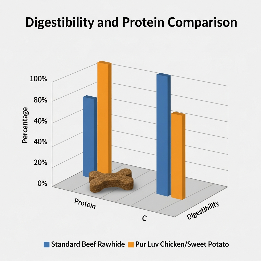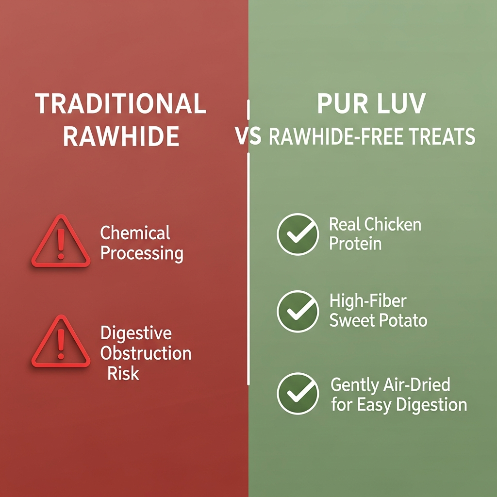The biggest win for these treats is that they are 100% rawhide-free. Traditional rawhide is notorious for being chemically bleached and potentially causing internal blockages because it doesn't break down easily in the gut. Because Pur Luv Chicken Wrapped Sweet Potato Dog Treats use real muscle meat and vegetable fiber, they are much easier for your dog’s stomach to handle. There's no risk of sharp fragments or the "choking hazard" slimy mess that usually comes with cowhide chews. Our research suggests these are a much safer bet for "gulpers" who tend to swallow treats quickly.
