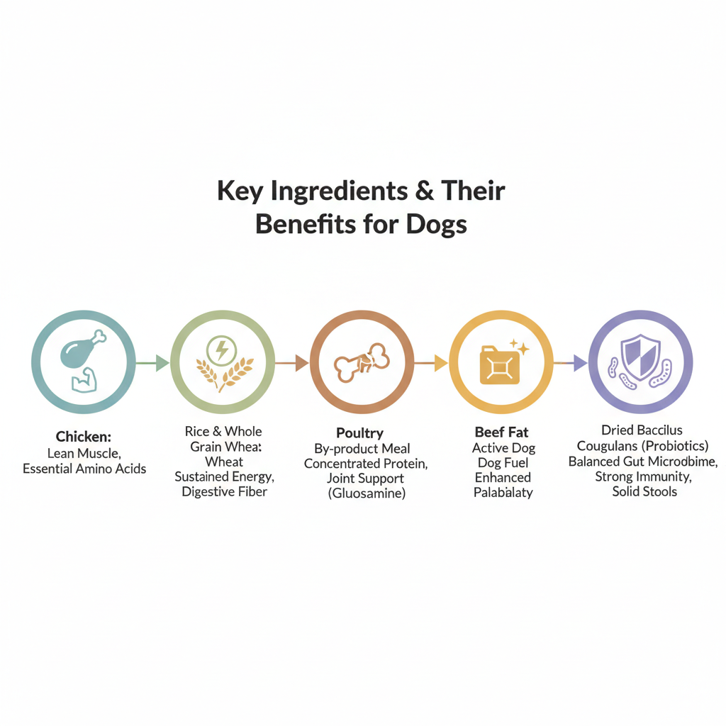 This formula is designed for maintenance and energy. By putting real meat first and backing it up with grains and probiotics, it targets the Complete Essentials that a typical active adult dog needs. Here is the estimated nutritional breakdown based on the guaranteed analysis: