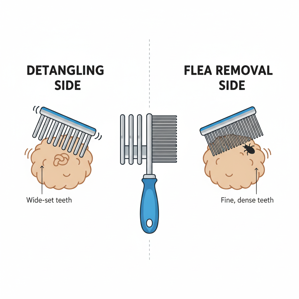 One side features sparse teeth, which I've found perfect for detangling "bed head" or slightly knotted fur on long-haired cats. The flip side houses high-density teeth designed to trap fleas, larvae, and even tiny flea dirt (flea excrement). Because these are made from 100% high-quality plastic, they don't rust after being dipped in soapy water—a crucial step when you're flicking live fleas off the comb.