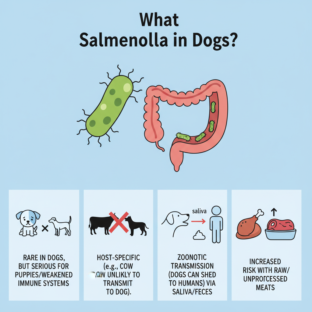 While salmonella infections in dogs are uncommon, the risk significantly increases when pet parents include raw or unprocessed meats in their dog’s diet.