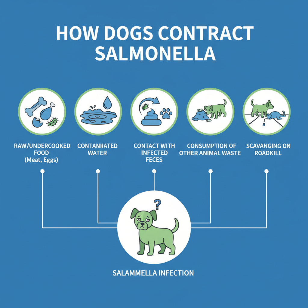 Dogs usually pick up Salmonella when they accidentally swallow the bacteria. Most often, this happens when they: