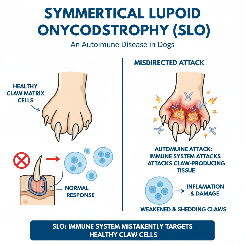 SLO in dogs primarily affects their claws. Here are some key symptoms to watch out for: