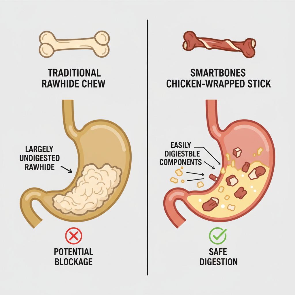 SmartBones Chicken-Wrapped Sticks are designed to bridge the gap between a delicious treat and a functional chew. While many traditional chews rely on tough, indigestible hides, our research shows that SmartBones uses a combination of vegetables (mainly corn) and real meats to create a texture that satisfies the urge to chew without the "gut-clogging" risks of rawhide. The addition of vitamins and minerals like Vitamin E and Zinc ensures your pup gets a little nutritional boost while they work on their snack.
