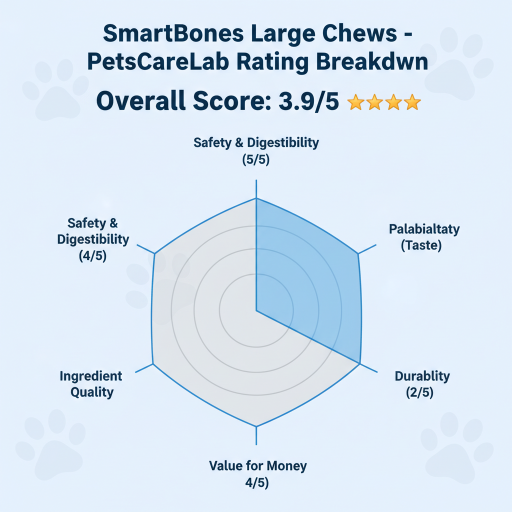 PetsCareLab’s conclusion: These SmartBones Large Chews are highly palatable, rawhide-free treats that use real chicken and sweet potato to entice large-breed dogs, making them an excellent choice for owners of adult pups who need a safer, easier-to-digest alternative to traditional hide, though they won't last long against power chewers.