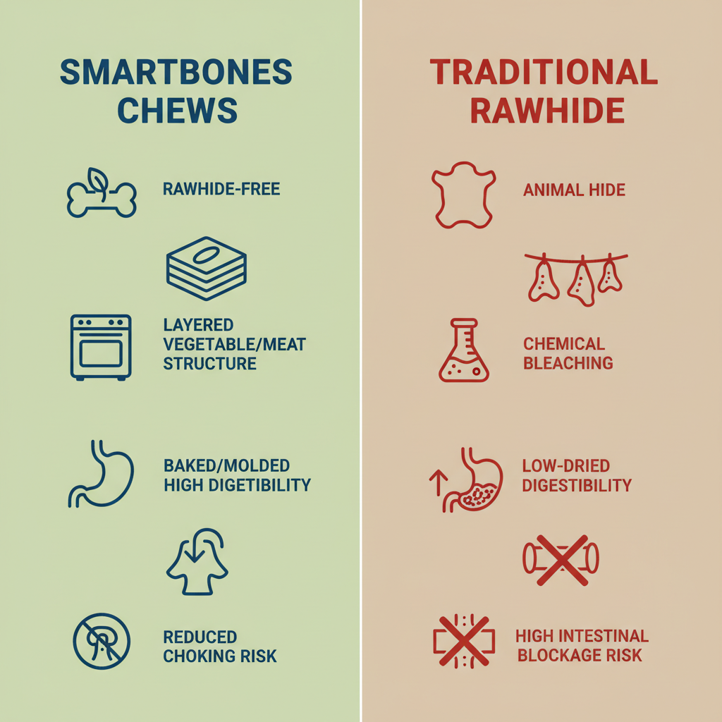 The biggest win for these chews is what they *don't* contain: rawhide. Traditional rawhide often involves harsh chemical bleaching and can cause dangerous intestinal blockages. SmartBones avoids this risk entirely. However, our research shows the recipe includes Titanium Dioxide for color and artificial flavors, which some "clean label" enthusiasts might want to avoid. Physically, the bone shape is sturdy, but once your dog starts crunching, the chew becomes soft and pliable. This significantly lowers the risk of sharp fragments or "choke points" compared to dried animal bones, though we always recommend keeping an eye on your dog until the last bite is gone.