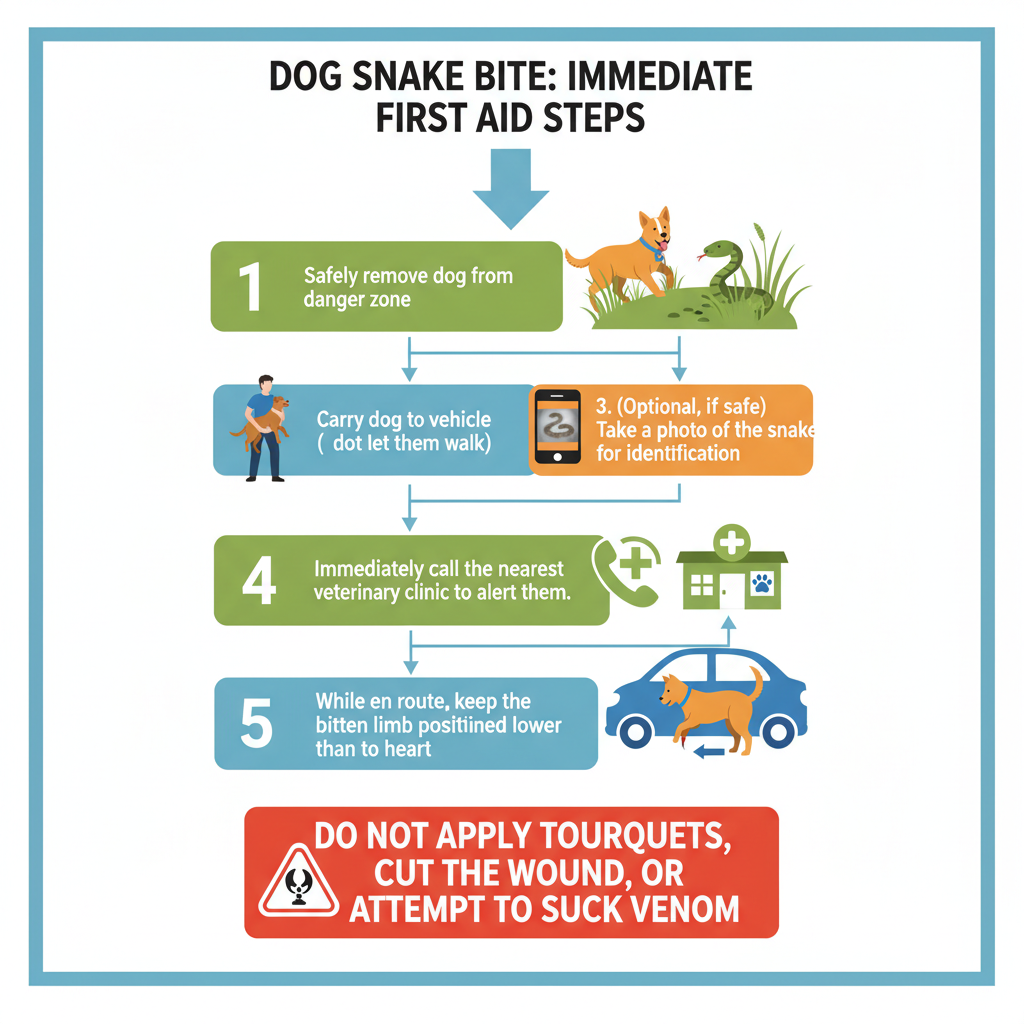 While driving to the veterinary hospital, keep the bitten limb lower than the heart whenever possible to slow venom circulation. Maintaining a calm environment for both you and your dog can help reduce stress and minimize toxin spread.