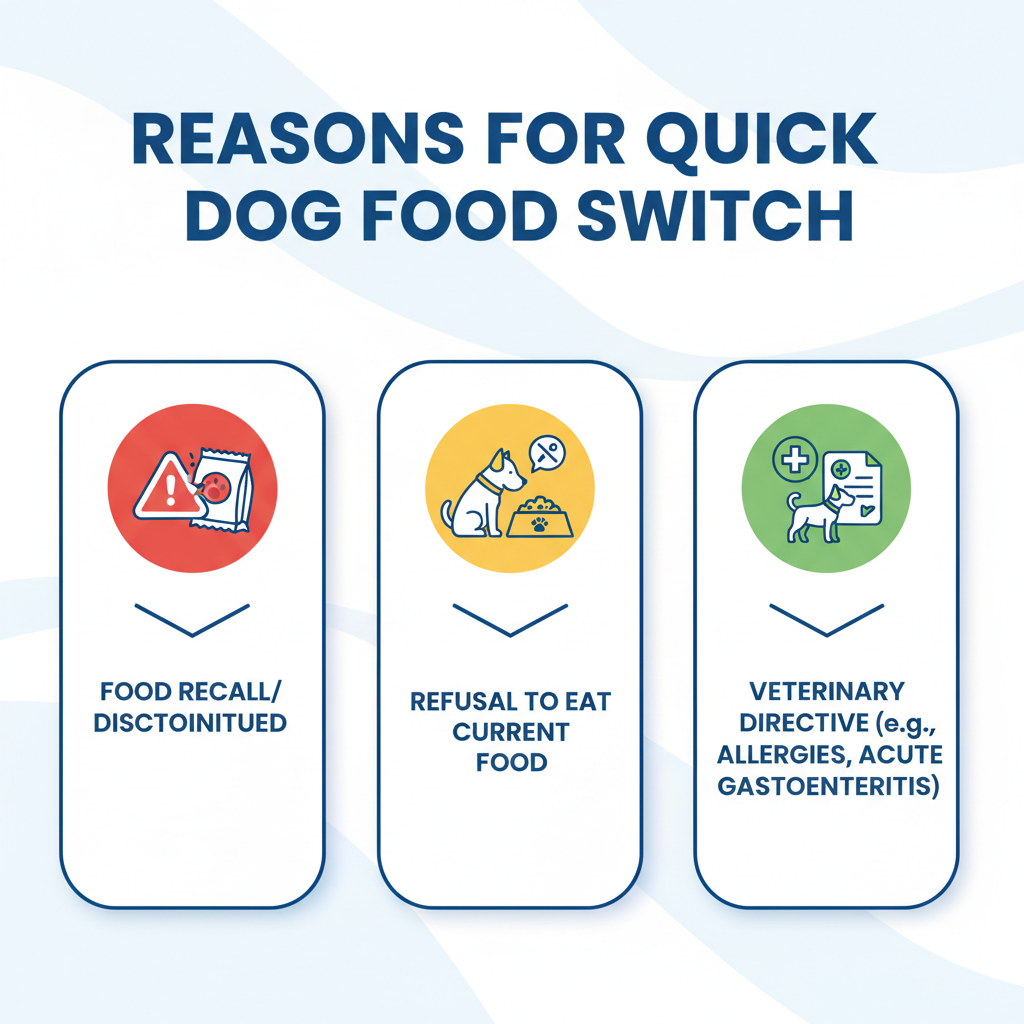 • Your dog's current food has been unfortunately recalled, permanently discontinued, or is simply unavailable through your usual channels.