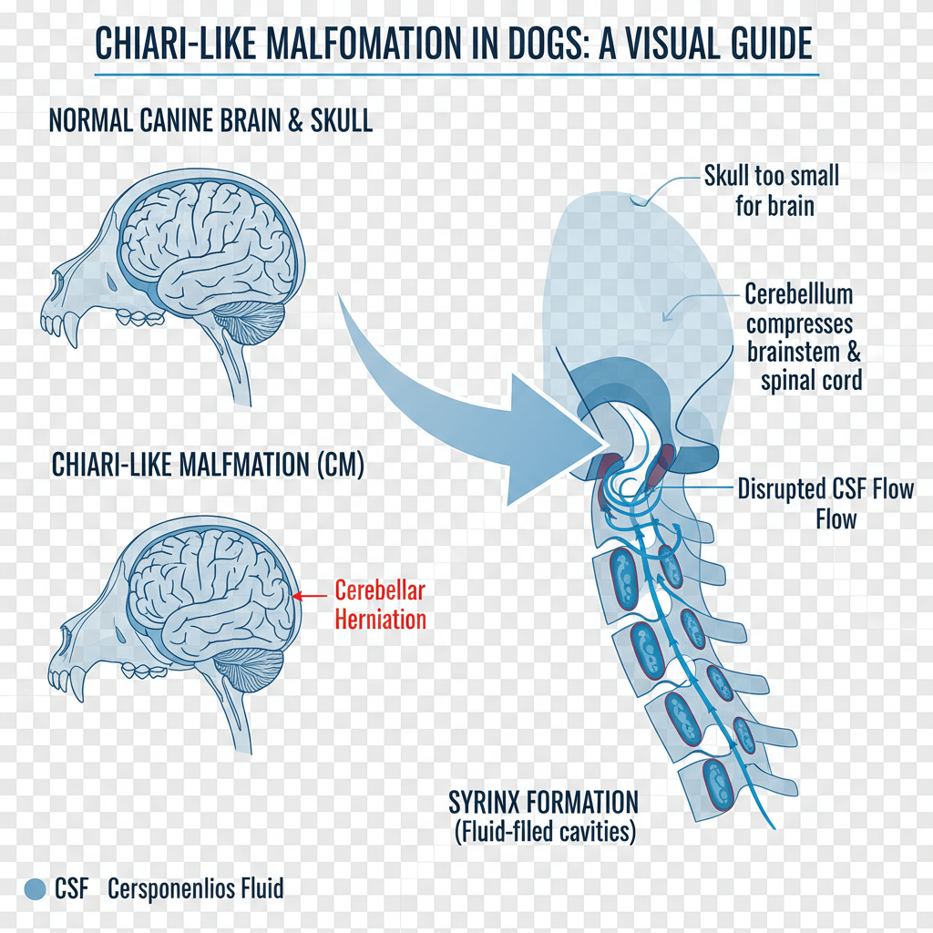 At its core, the problem is caudal fossa hypoplasia—meaning the back part of the skull isn't quite big enough. This anatomical flaw causes a chain reaction: