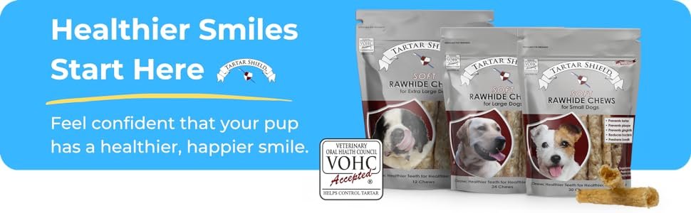 Tartar Shield Soft Rawhide Chews are VOHC-approved dental treats rated 4.5/5 stars, proven to reduce tartar by over 54%. Ideal for large breed dogs of all ages, they offer a gentle yet effective solution for dental care without brushing.