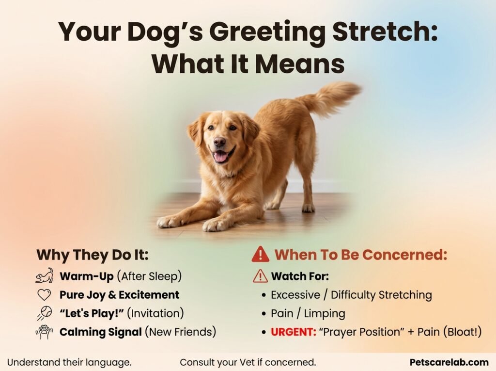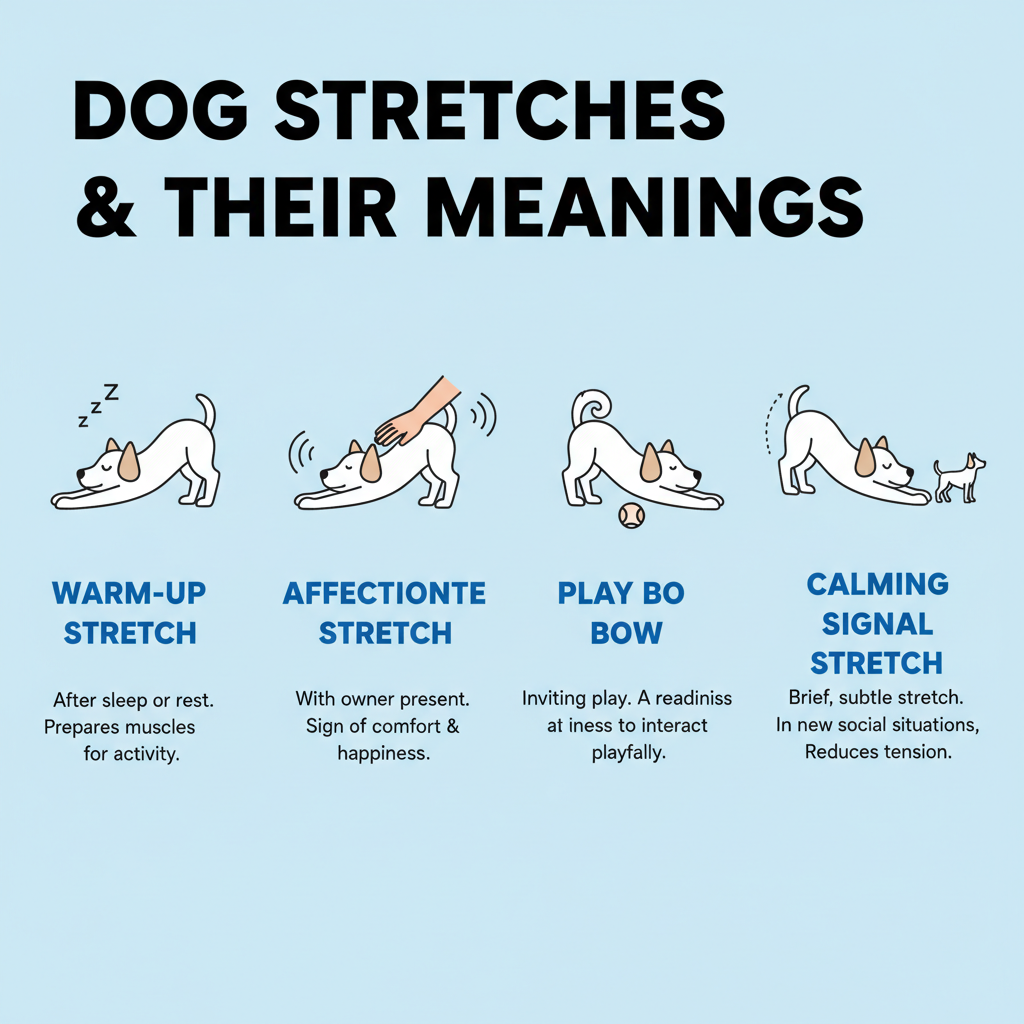 Always pay attention to the situation and your dog’s other body language. If the stretching comes with other signs of stress or fear (like a tucked tail, flattened ears, or lip licking), it might mean your dog feels uncomfortable, not playful or affectionate.