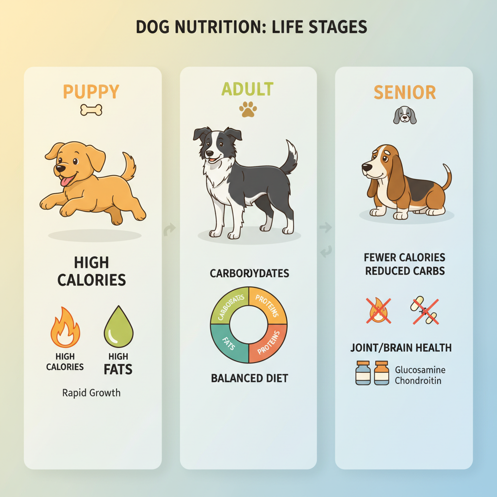 "Puppies need a higher intake of calories and fats to fuel their rapid growth," Petscarelab’s veterinarian explains. "Adults benefit from a balanced diet rich in carbohydrates, fats, and proteins, while seniors typically need fewer calories and reduced carbohydrates."