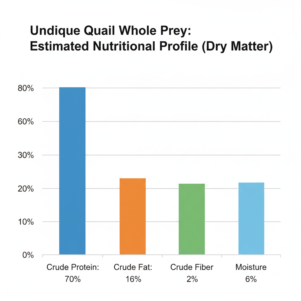 The ingredient list is as short as it gets: Quail (100%). There are no fillers, grains, or soy. Since it's a "whole prey" item, it includes the muscle meat, heart, liver, and bones.