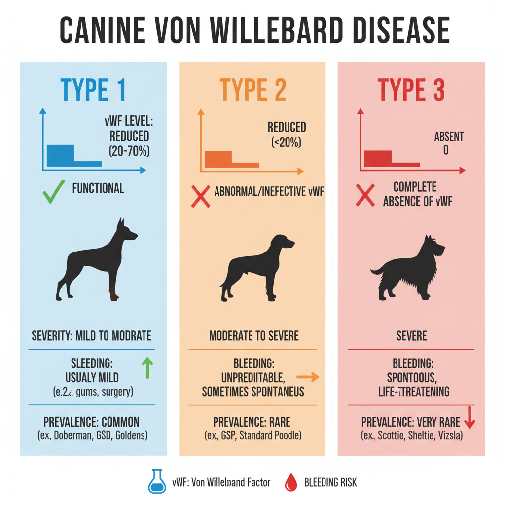 Veterinary specialists categorize von Willebrand disease into three main types, based on how much vWF is present in your dog's blood.