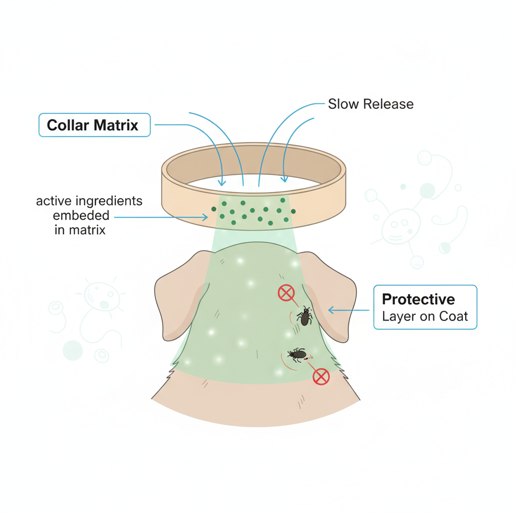 Unlike traditional sprays that wear off in days, this flea and tick collar for dogs uses a sophisticated sustained-release matrix. The active ingredients are embedded into the collar’s structure and migrate onto the skin and coat over time.