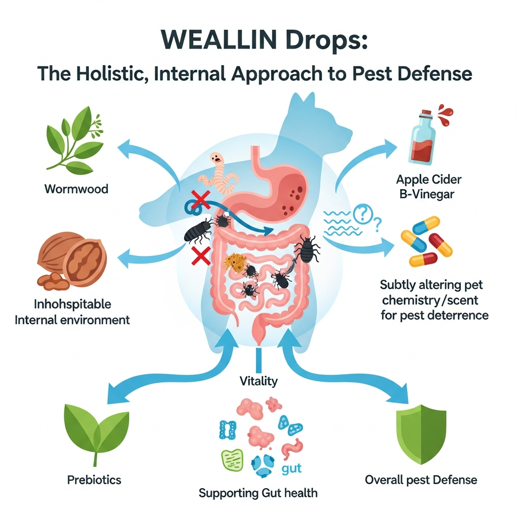 Instead of relying on harsh synthetic pesticides to kill pests on contact, WEALLIN takes a holistic, internal approach. I noticed the ingredient list reads more like a premium wellness supplement than a bug deterrent. The formula uses Wormwood and Black Walnut Extract, which herbalists traditionally use to create an inhospitable internal environment for parasite defense.