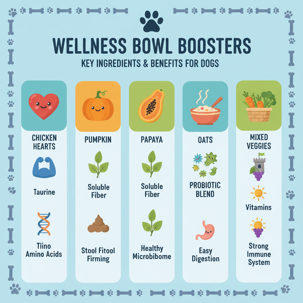 Our research at Petscarelab shows that the Wellness Bowl Boosters Digestive Health recipe is built on a foundation of organ meat and "superfood" fibers. Unlike many toppers that rely on fillers, this formula uses freeze-dried chicken hearts as the primary protein source. This keeps the nutrients intact without the heavy processing found in standard kibble.