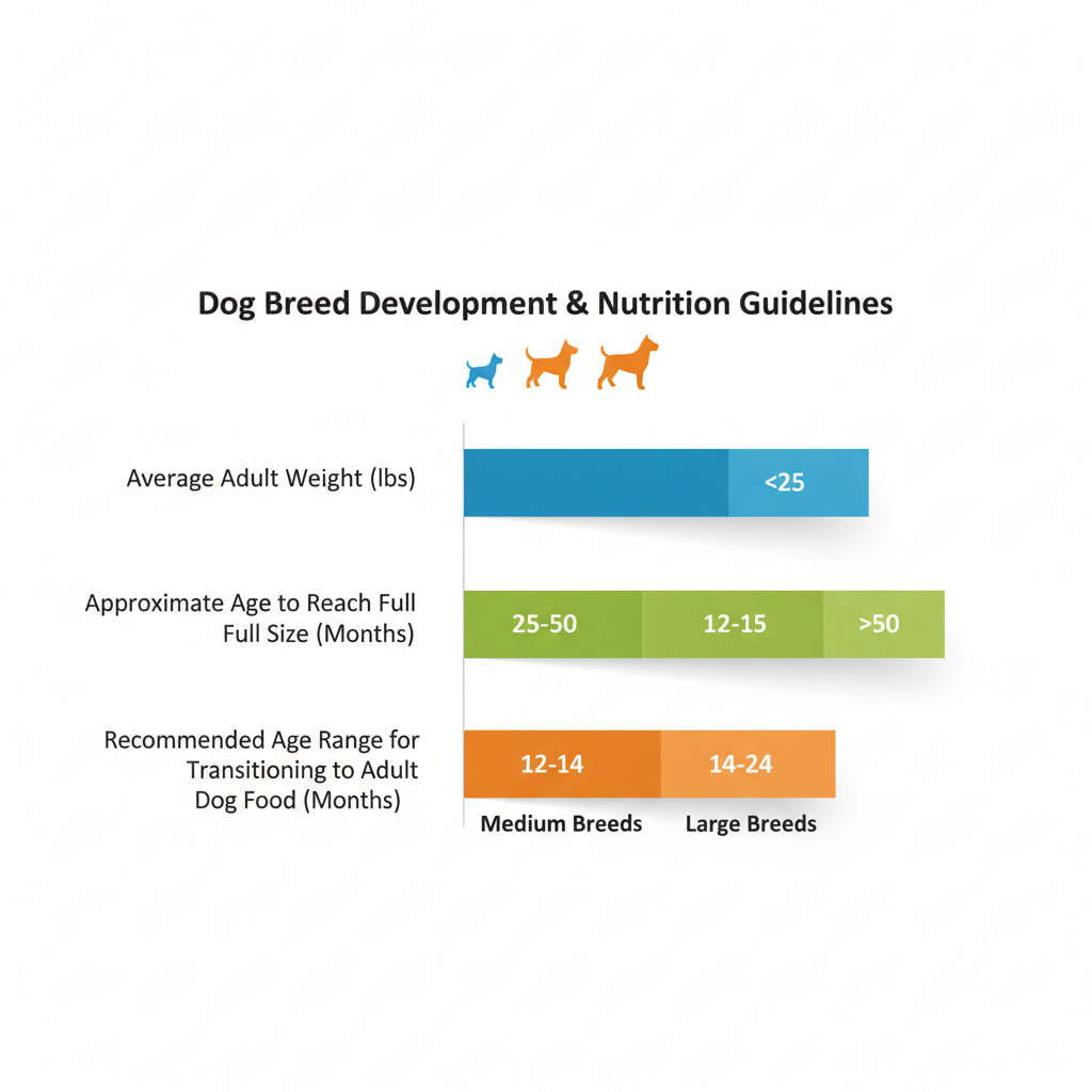 • Medium Breeds (25-50 lbs): Achieve full size between 12-15 months. These pups should switch to adult food around 12-14 months.