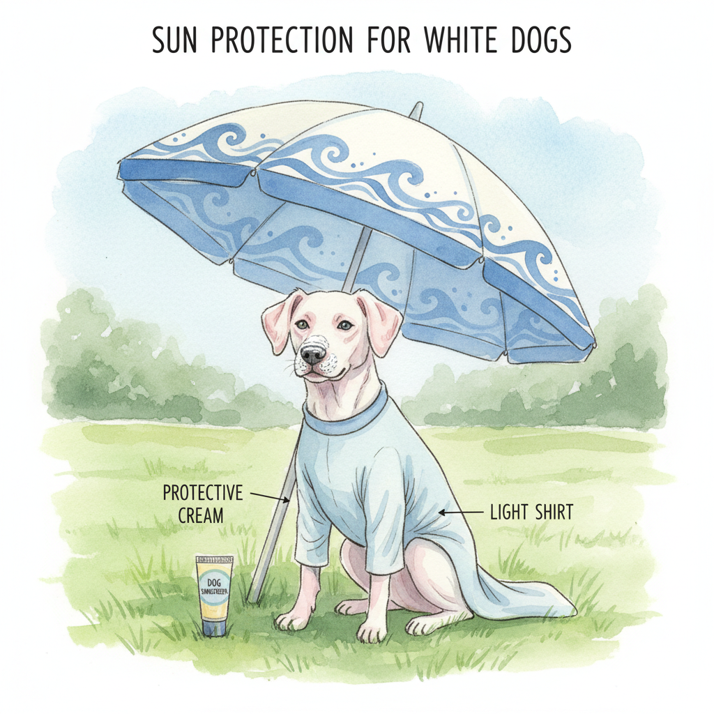 Yes, white dogs, especially those with short or thin fur and pink skin, can get sunburned easily. You should apply sunscreen to exposed areas like their nose, ear tips, and belly. It’s super important to use dog-specific sunscreen because human sunscreens can contain ingredients (like zinc oxide or para-aminobenzoic acid/PABA) that are toxic if your dog licks them off.