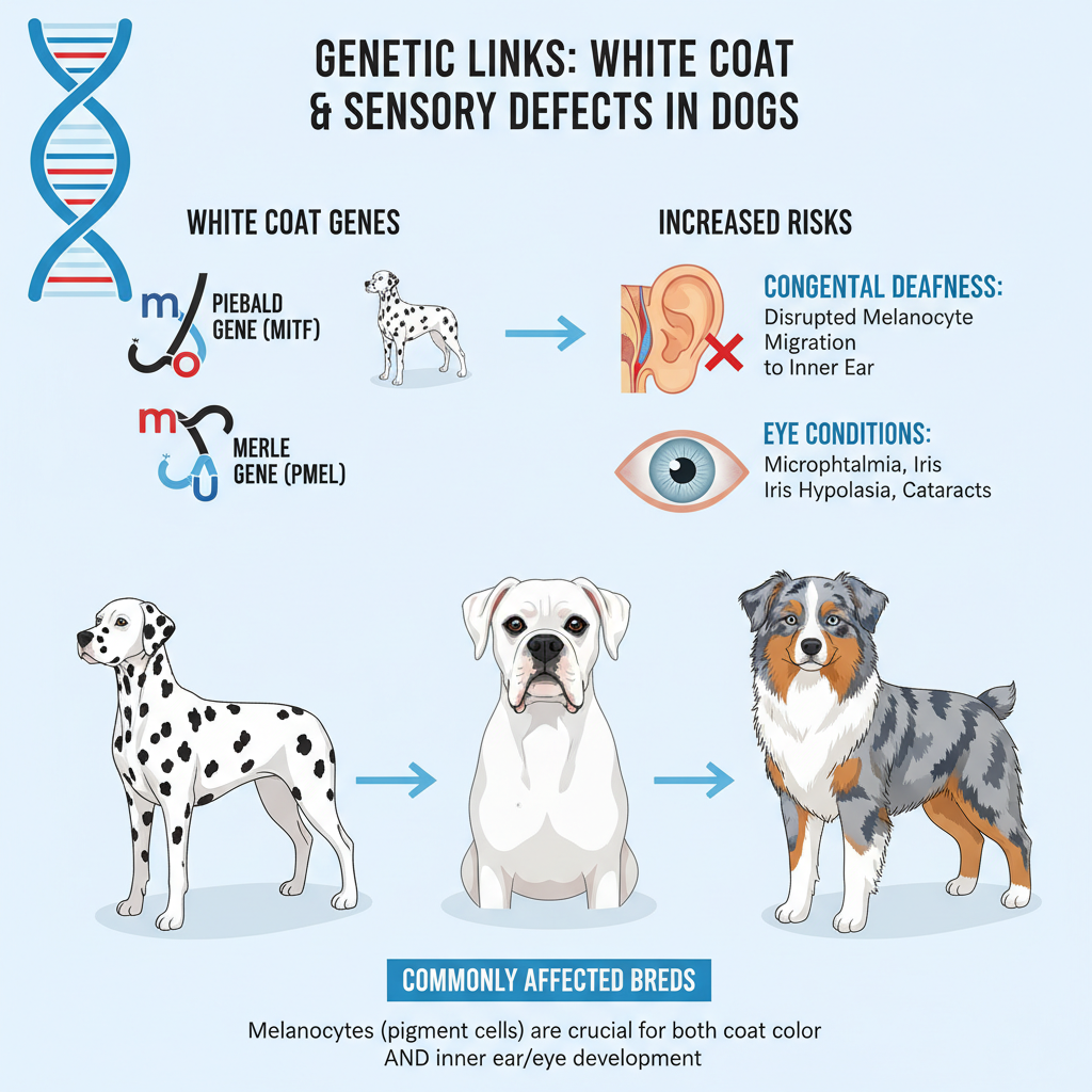 The same genes that give dogs their beautiful white coats, especially the merle and piebald genes, have been linked to a higher risk of congenital deafness (being born deaf). Breeds like Dalmatians, white Boxers, and certain types of white English Setters are more prone to this condition.