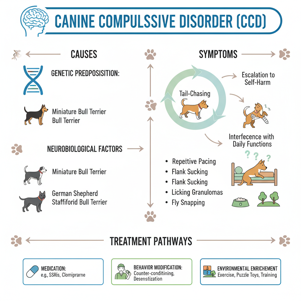 Canine compulsive disorder (CCD) presents with behaviors that closely resemble stereotypic actions but are distinguished by their lack of direct connection to immediate environmental triggers. Dogs afflicted with CCD may be exceedingly difficult to interrupt once they begin chasing their tail, often resuming the behavior almost immediately even after brief redirection.
