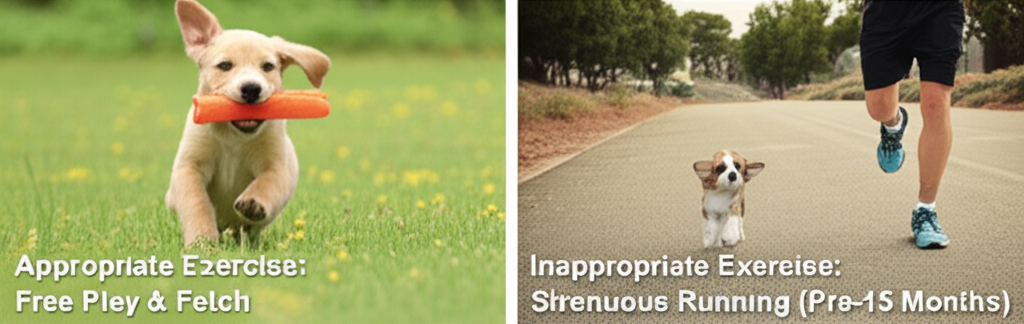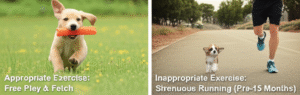 Playing fetch or letting your puppy run freely until tired is perfectly fine. However, avoid jogging or running with your puppy until their growth plates have closed. For those planning to have a medium or large breed dog as a running companion, the best advice is to wait until after about 15 months of age to allow bones adequate time to mature.