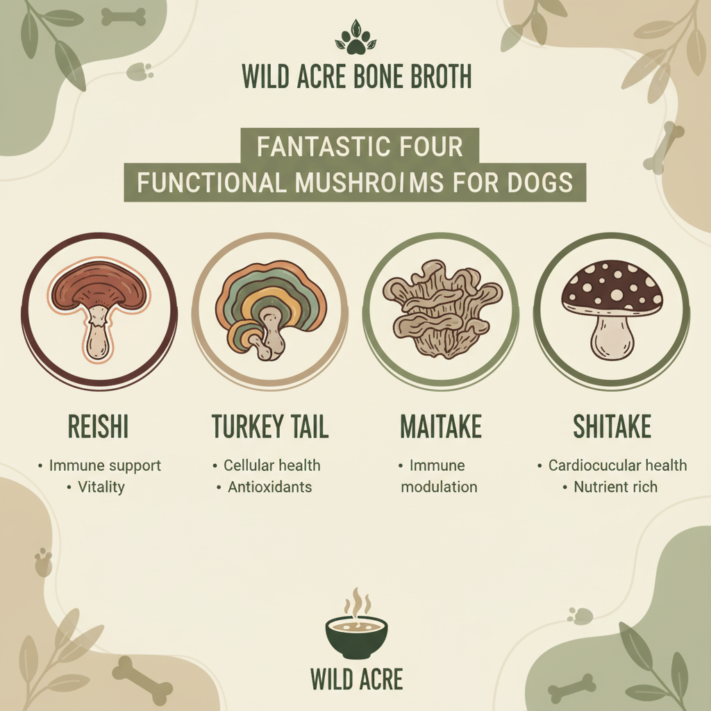 This "fantastic four" of fungi is what sets Wild Acre Premium Beef Bone Broth for Dogs apart from the competition. These aren't just for show; they are packed with beta-glucans that give the immune system a serious leg up. Reishi is often called the "mushroom of immortality" for its health-boosting properties, while Turkey Tail is a powerhouse for cellular health.
